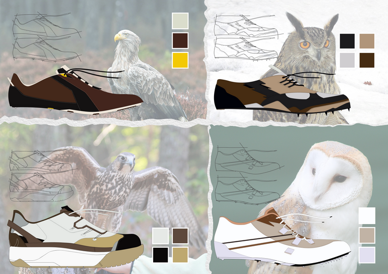 This project looks to support and conserve the natural wildlife of Poland through bringing attention to who and what makes the country what it is. 'Reinvesting' is the key term that this design process aims to highlight. The native fauna and flora are the drawing points that bring life and meaning to the footwear styles. From taking inspiration from Poland’s iconic animals and natural environments to ensuring they remain protected. Many populations of native species have unfortunately been diminished, wiped out, or put at risk of endangerment. Having stable numbers of species is vital to healthy functioning ecosystems so it's just as important to keep them alive and put them in a position to thrive.